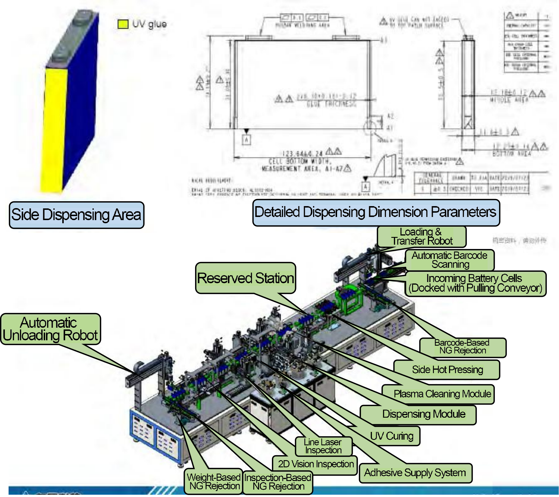 plasma cleaning, UV glue application, UV curing, dimensional inspection, and automatic unloading.